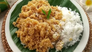 Tiwul merupakan makanan pokok tradisional khas jawa yang terbuat dari singkong yang di keringkan (gaplek). Kemudian di tumbuk hingga halus seperti tepung lalu dikukus hingga matang. Di saji kan bersama kelapa parut yang di kasih jula pasir.